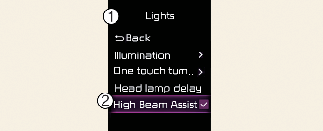 With the vehicle in the ON position, select Lights → High Beam Assist from the Settings menu to turn on High Beam Assist function.