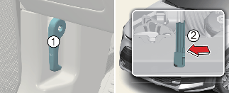 Go to the front of the vehicle, raise the bonnet slightly, push the secondary bonnet release lever (2) to the left and lift the bonnet.