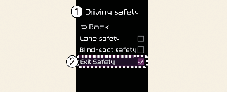With the vehicle on, touch Settings → Driver Assistance → Driving safety → Exit Safety on the instrument cluster or Settings → Vehicle → Driver Assistance → Driving Safety → Exit Safety on the infotainment system.