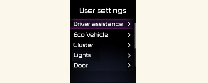 Seleccione Ajustes → Vehículo → Asistencia al conductor en la pantalla del sistema de infoentretenimiento para ajustar la función Asistencia al conductor.