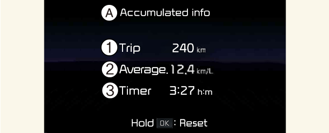 Para reiniciar la información manualmente, mantenga pulsado el botón OK en el volante mientras se muestra la Información acumulada.