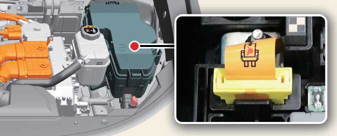 응급 상황에서 고전압 차단 스위치의 노란색 라벨을 잡아 당기면 구동용(고전압) 배터리가 차단됩니다.