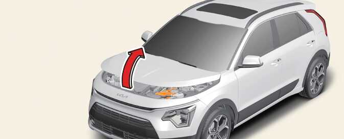 중앙에 위치한 2차 열림 레버(2)를 왼쪽으로 밀고 있는 상태에서 후드를 위로 들어 올리십시오.