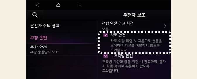 차로 안전: 차로 안전을 선택하면 차로 이탈이 감지될 경우 차로를 이탈하지 않도록 조향을 도와줍니다.