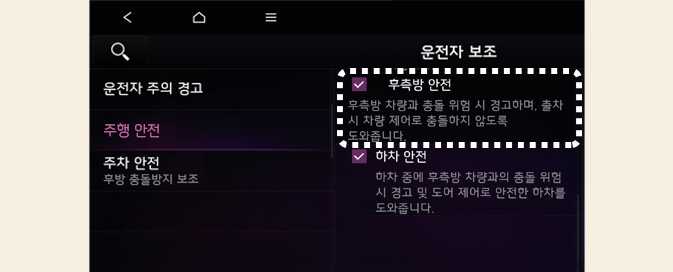 후측방 안전: 후측방 차량과 충돌 위험 시 경고하며, 출차 시 차량 제어로 충돌하지 않도록 도와줍니다.