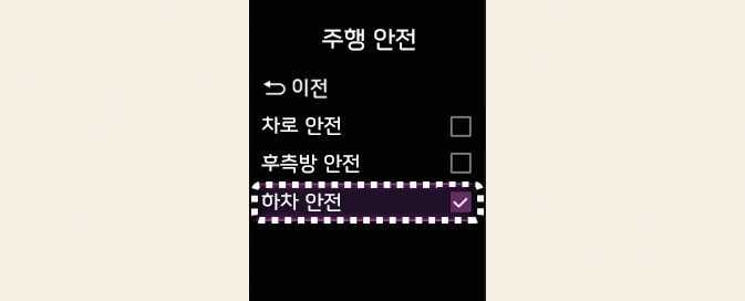 시동 'ON' 상태에서 클러스터의 ‘사용자 설정 → 운전자 보조 → 주행 안전 → 하차 안전’ 또는 인포테인먼트 시스템의 ‘설정 → 차량 → 운전자 보조 → 주행 안전 → 하차 안전’을 차례로 선택하십시오. 안전 하차 보조가 켜집니다.