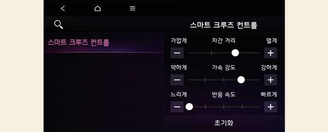 시동 'ON' 상태에서 클러스터의 ‘사용자 설정 → 운전자 보조 → 주행 편의 → 스마트 크루즈 컨트롤’ 또는 인포테인먼트 시스템의 ‘설정 → 차량 → 운전자 보조 → 주행 편의 → 스마트 크루즈 컨트롤’을 차례로 선택하십시오. 차간거리, 가속 강도, 반응 속도를 개별적으로 설정할 수 있습니다.