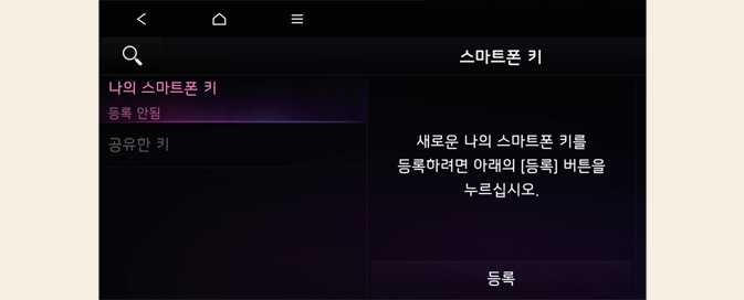 인포테인먼트 시스템에서 ‘설정 → 차량 → 디지털키 → 스마트폰 키 → 나의 스마트폰 키’를 선택하여 등록 화면으로 이동하십시오.