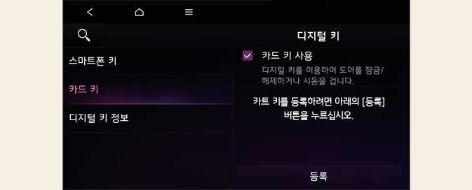 차량 시스템에 카드 키가 이미 등록되어 있으면 새 카드 키를 등록할 수 없습니다. 디지털 키 2 터치(카드 키) 삭제를 진행한 후 등록하십시오.