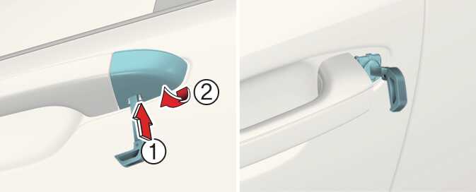 비상시 커버(2) 탈거 후 비상키(1)를 이용하여 운전석 도어를 잠그거나 열 수 있습니다.