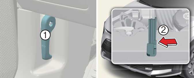 중앙에 위치한 2차 열림 레버(2)를 왼쪽으로 밀고 있는 상태에서 후드를 위로 들어 올리십시오.