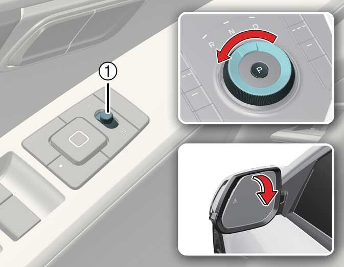 실외 미러 하향 각도를 조절하려는 경우 실외 미러 조절 선택 스위치(1)를 L(왼쪽) 또는 R(오른쪽)에 놓으십시오.