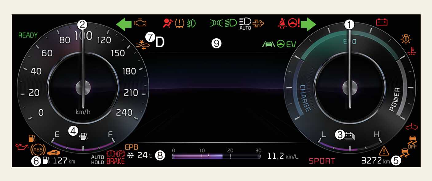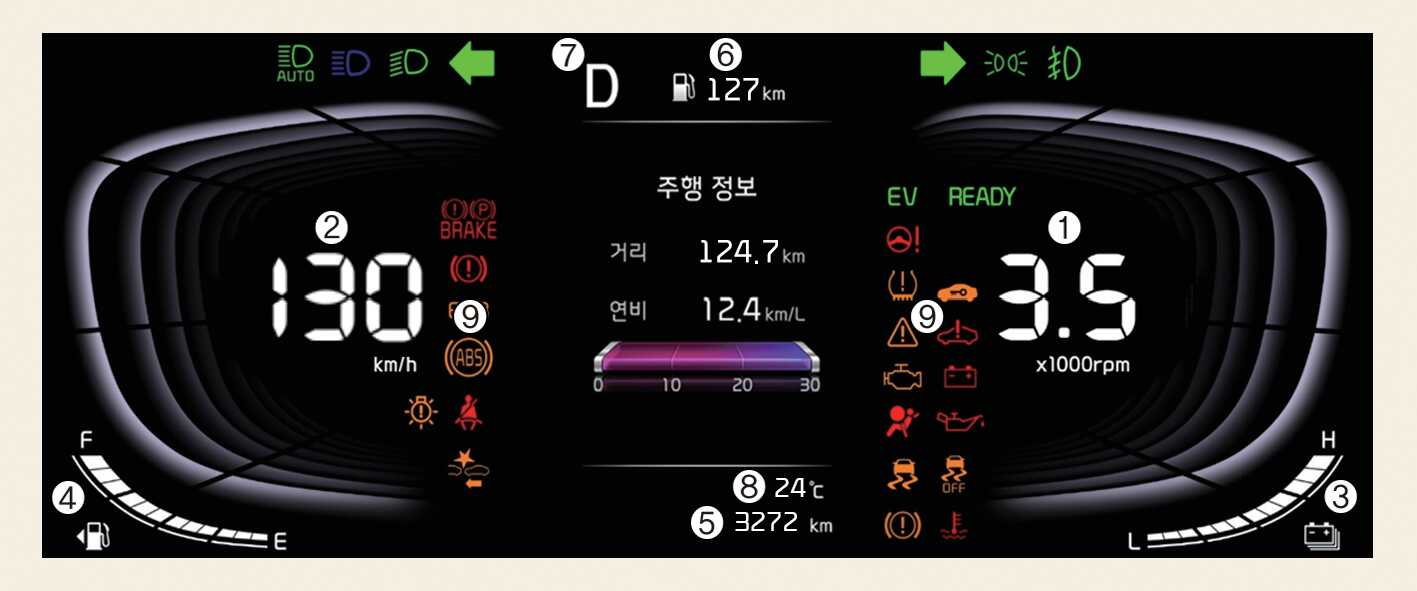 B 타입 클러스터클러스터의 경우, 인포테인먼트 시스템의 '차량→클러스터클러스터→엔진 회전 속도계' 메뉴에서 선택한 드라이브 모드에서 엔진 회전계가 표시됩니다.