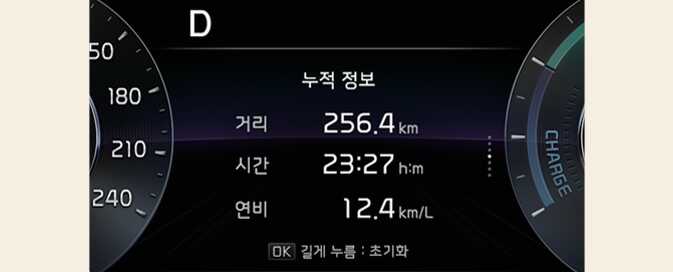 초기화 시점부터 현재까지의 주행 거리/연비/시간 누적 정보를 표시합니다.