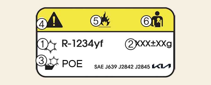 이 차량은 친환경적인 신냉매 R-1234yf가 적용되어 있습니다. 신냉매는 기존에 적용되어 있던 구냉매 R-134a와 대비하여 지구 온난화 현상을 크게 줄일 수 있습니다. 실제 차량에 사용된 냉매 종류와 용량을 알 수 있도록, 후드 안쪽에 사양 라벨이 부착되어 있습니다.