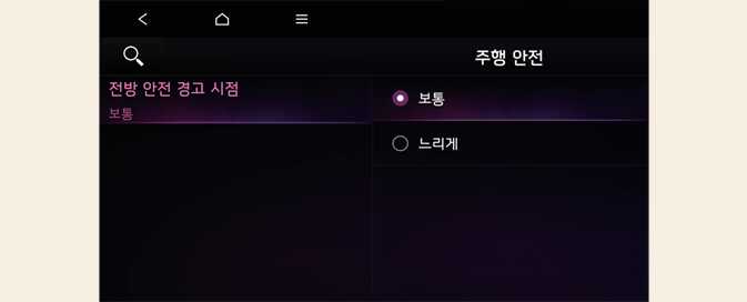 경고 시점을 변경하면 다른 운전자 보조 시스템의 경고 시점도 같이 변경될 수 있습니다. 고려하여 변경하십시오.