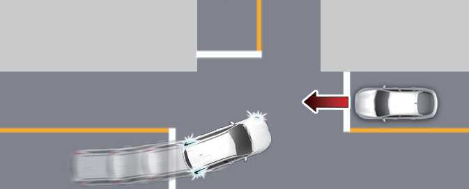 교차로에서 방향지시등 스위치를 내리고 좌회전할 때 맞은편 인접 차로에서 접근하는 차량과의 충돌 위험이 판단되면 충돌하지 않도록 제동을 도와줍니다.