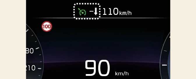 수동 속도 제한 보조 또는 스마트 크루즈 컨트롤이 작동하는 중에 도로의 제한속도가 변경되면 위 또는 아래 방향의 화살표를 통해 설정속도 변경이 필요함을 알립니다. (+) 또는 (-) 스위치를 눌러 제한속도에 맞게 설정속도를 변경할 수 있습니다.