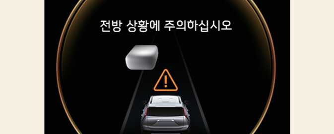 전방 상황 주의 알림이 발생하면 새롭게 나타난 전방의 차량이나 물체와 충돌할 수 있습니다. 전방 도로 상황 및 주행 상태를 확인하고 필요하면 브레이크 페달을 밟아 직접 속도를 조절하십시오.