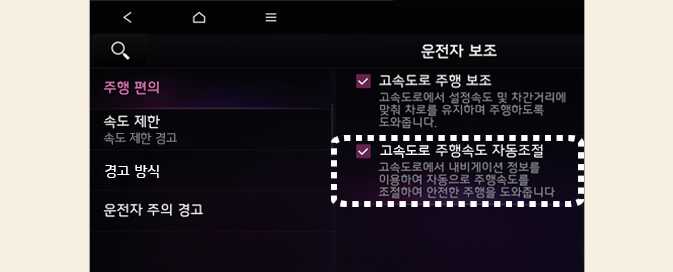 내비게이션 기반 스마트 크루즈 컨트롤에 이상이 발생한 경우 설정 메뉴에서 기능을 설정할 수 없습니다.