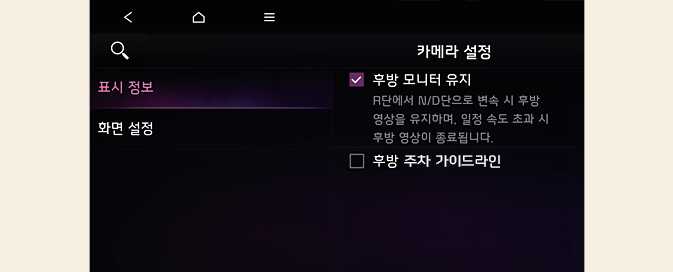 표시 정보: 후방 주차 가이드와 후방 모니터 유지 기능을 설정할 수 있습니다.