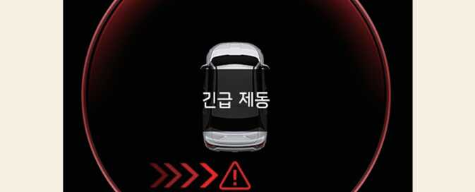 사이드 미러(실외 미러) 경고등, 경고문, 경고음을 통해 긴급 제동을 알립니다. 인포테인먼트 시스템 화면의 후방 영상에도 경고가 표시됩니다(사양 적용 시). 긴급 제동이 작동하면 후측방에서 접근하는 차량과의 충돌을 방지하기 위해 제동 제어를 도와줍니다.