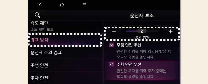경고 방식을 변경하면 다른 운전자 보조 기능의 경고 방식도 같이 변경될 수 있습니다. 고려하여 변경하십시오.