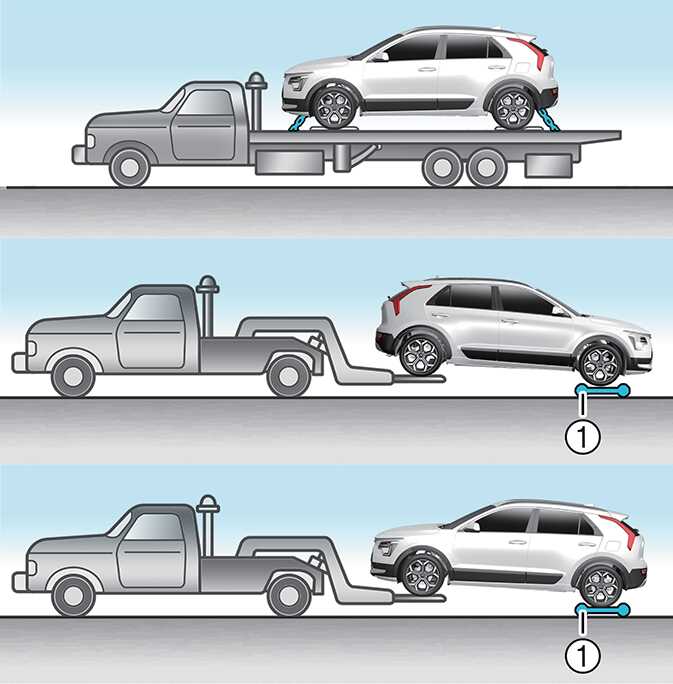 상차 견인이 불가할 경우에는 앞 또는 뒷바퀴를 지그에 올리고 나머지 바퀴를 지면에 닿지 않도록 돌리(1)를 사용하여 견인하십시오.