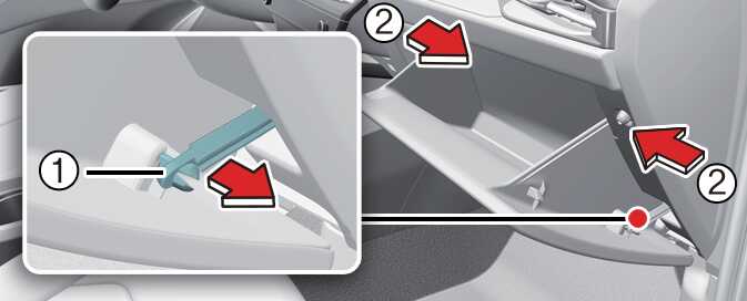 글로브박스를 열고, 오른쪽 옆면의 지지대(1)를 분리하고 글로브박스의 양옆(2)을 누른 상태에서 아래로 잡아당겨 분리하십시오.