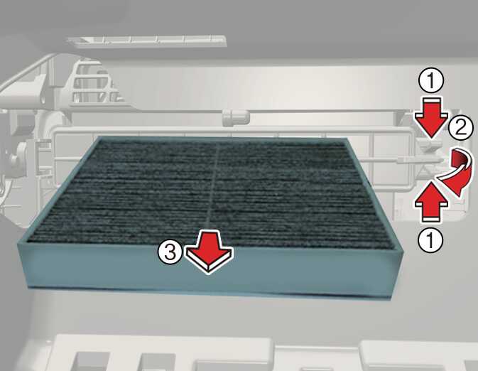 공조 장치용 에어필터 받침대 커버의 오른쪽(1)을 누른 상태에서 받침대 커버를 잡아당기십시오(2). 에어필터를 잡아당겨(3) 빼낸 후 새 에어필터로 교체 하십시오. 조립은 분해의 역순입니다.