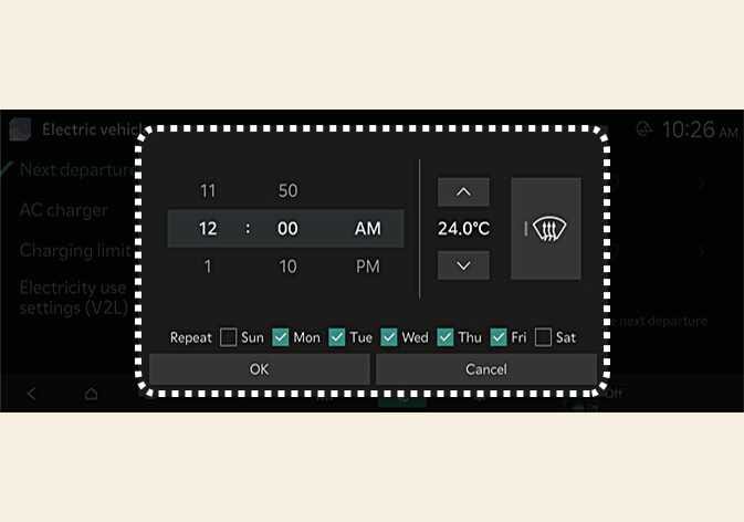 Sie können das Datum und die Uhrzeit, wann die Batterie geladen werden soll, sowie die Temperatur für die Klimaanlage einstellen. Außerdem können Sie einstellen, zu welcher Zeit der Ladevorgang beginnen soll und dabei eine Einstellung in der Nebenzeit verwenden. |