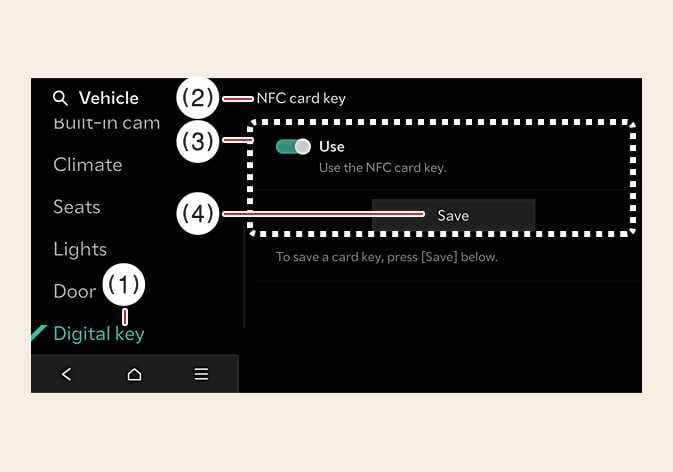 Um den Kartenschlüssel als digitalen Schlüssel 2 zu verwenden, registrieren Sie den Kartenschlüssel gemäß den folgenden Verfahren im Fahrzeugsystem.