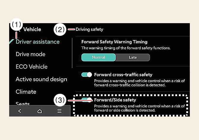 Kollisionssicherheit in Fahrtrichtung/Seite: Eine Kollisionswarnung oder eine Notlenkung unterstützt den Fahrer in einer Kollisionssituation. Wenn Sie die Einstellung deaktivieren, erlischt die Kollisionssicherheit in Fahrtrichtung und die Warnleuchte der Notlenkung (