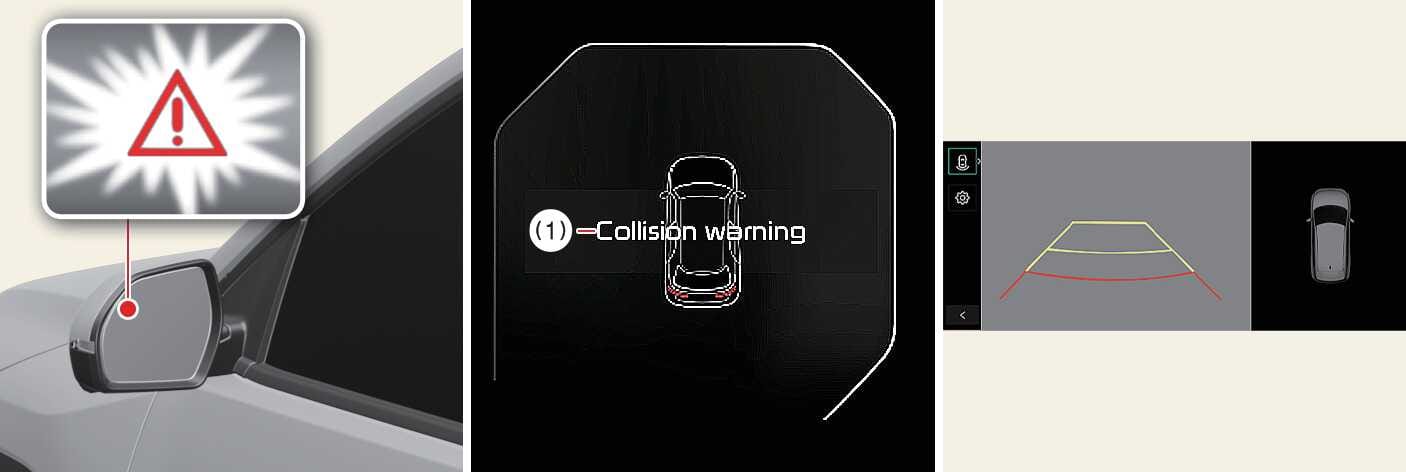 Die Kollisionswarnung warnt den Fahrer durch eine Warnleuchte in den Außenspiegeln, mit einer Warnmeldung, sowie durch einen Warnton und Lenkradvibration.