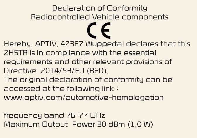 Die Funkfrequenzkomponenten (Eckradar vorn/Eckradar hinten) erfüllen folgende Anforderungen (ausstattungsabhängig):