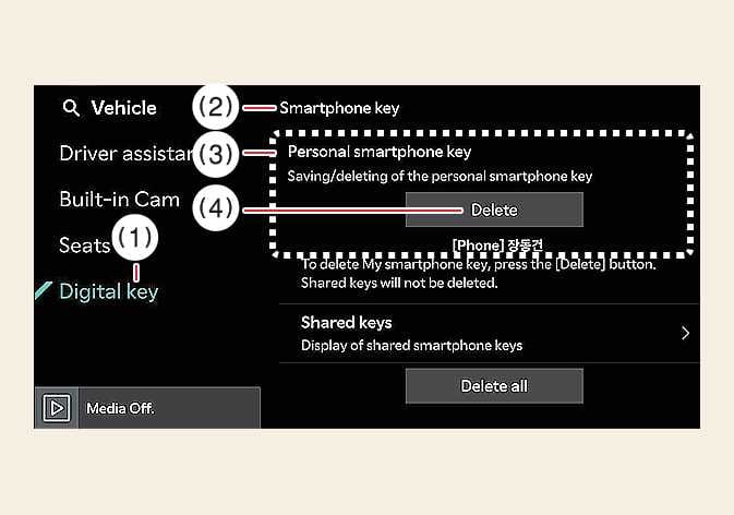 Turn the vehicle on with the smart key and make sure to keep the smart key inside the vehicle during the digital key (smartphone) deleting process.
