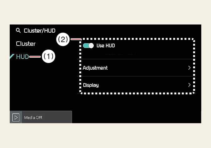 After turning on the head-up display, you can change the settings of Display Control and Content Selection of the Head-Up Display.