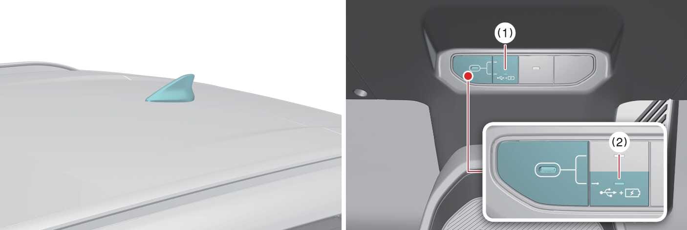 Press the button (1) and when the USB port and charger indicator light turns on (2), you can use the USB port to plug in a USB.