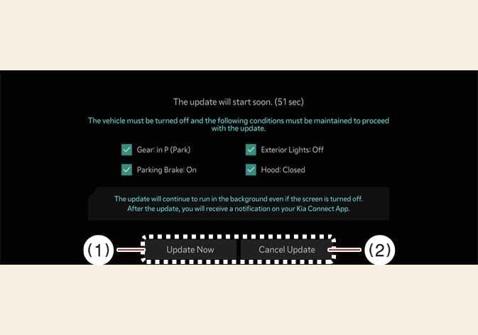 If you press the Start button on the screen, the vehicle will begin installing the update automatically. The following conditions must be satisfied: