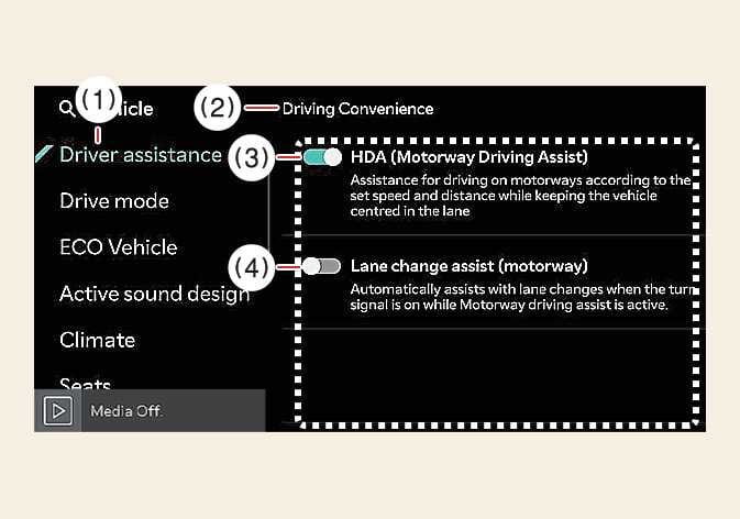 If HDA (highway Driving Assist) is selected, it helps maintain distance from the vehicle ahead, maintain the set speed, and helps centre the vehicle in the lane.