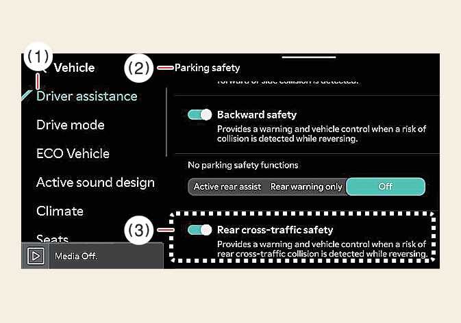 With the vehicle is in DRIVE READY, select on the infotainment system screen to turn on Rear Cross-Traffic Collision-Avoidance Assist.