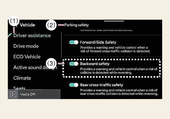 With the vehicle is in DRIVE READY, Backward safety will be selected and Parking Collision-Avoidance Assist settings will be retained whenever the vehicle is restarted.