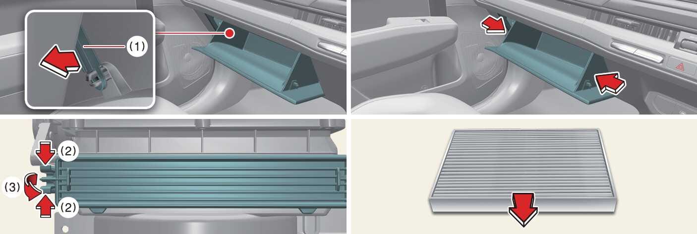 Remove the climate control air filter cover (2) by pulling out left side of the cover (3).