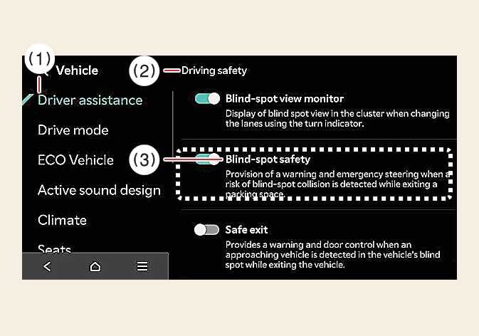 Se Sicurezza punti ciechi è deselezionata, il conducente non può ricevere l'aiuto dall’Assistenza anti collisione punti ciechi. Guidare sempre con prudenza.