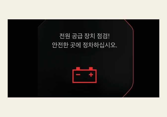 전기차 전원 공급 시스템에 고장이 났거나 이상이 있으면 경고문이 표시됩니다. 이 경우 차량을 안전한 곳에 정차한 후 차량을 견인하여 자사 직영 서비스센터나 서비스협력사에서 점검 및 정비를 받으십시오. |