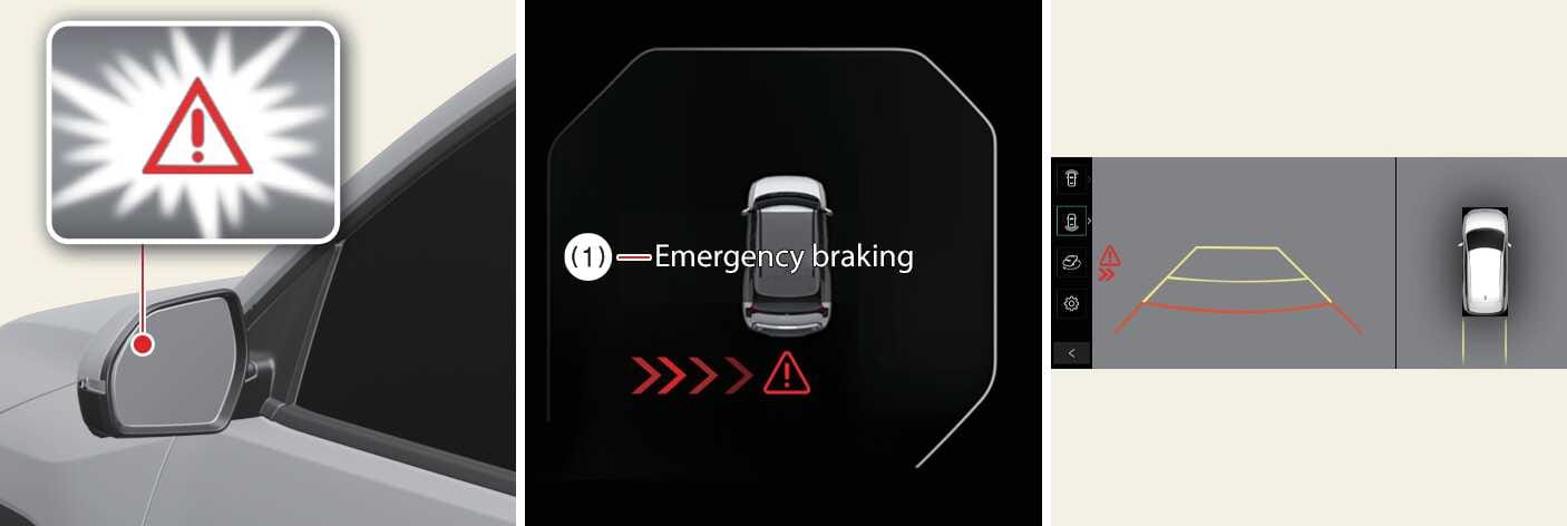 De Aanrijdingswaarschuwing waarschuwt de bestuurder met het een waarschuwingslampje op de buitenspiegels, een waarschuwingsmelding, een hoorbare waarschuwing en trilling van het stuurwiel.