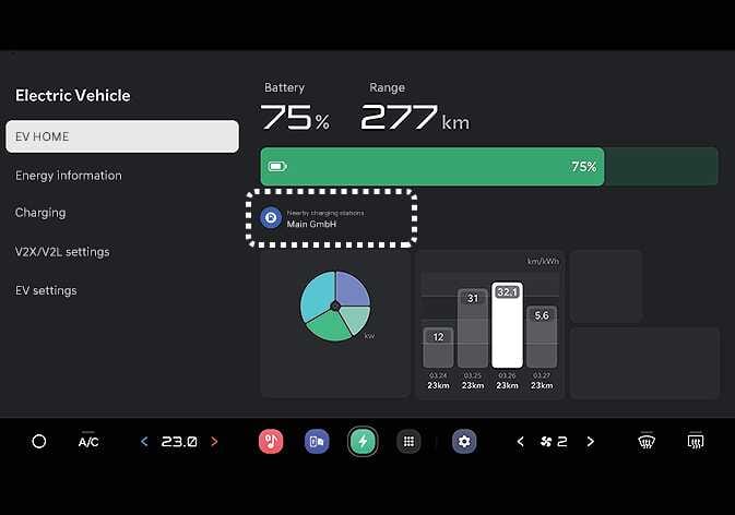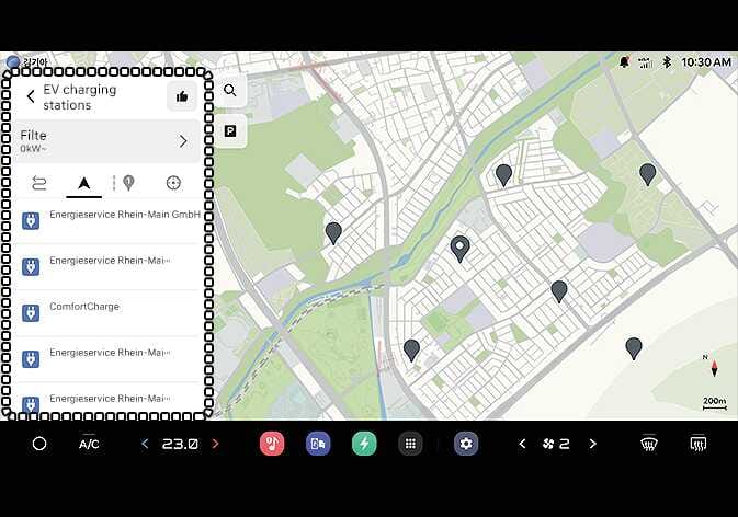 Wählen Sie das Widget aus und sehen Sie die Karte auf dem Bildschirm des Infotainment-Systems. Es wird nach Ladestationen in der Umgebung des aktuellen Standorts gesucht. |