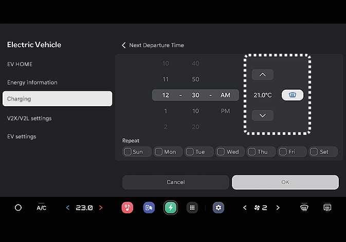 Wenn die Zieltemperatur bei angeschlossenem Kabel eingestellt ist, wird die Kabinentemperatur auf die Zieltemperatur zur Abfahrtszeit eingestellt (ohne Ladungsverlust der Hochspannungsbatterie). Bei kalter Witterung trägt die Vorheizung dazu bei, die Leistung von Elektrofahrzeugen zu verbessern, indem das Fahrzeug im Voraus geheizt wird.