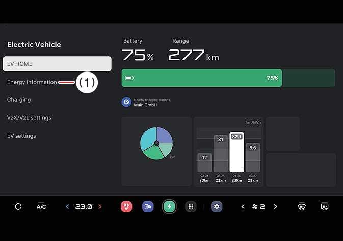 Wählen Sie auf dem Bildschirm Energieinformationen. Sie können die Funktionen Ladelimit, Ladestrom, Batteriezustandsmodus und Standmodus einstellen.