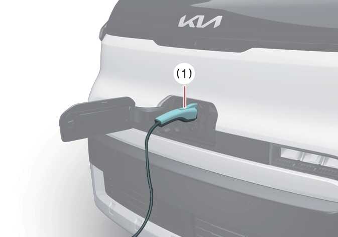 Wenn die Entriegelungstaste (1) am Ladestecker auch nach dem Entriegeln der Fahrzeugtür nicht funktioniert, ziehen Sie das Notentriegelungskabel im Motorraum und drücken Sie dann die Entriegelungstaste (1), um den Ladestecker zu trennen. Wenn die Entriegelungstaste (1) weiterhin nicht funktioniert, empfehlen wir, sich an einen autorisierten Kia-Händler/Servicepartner zu wenden.